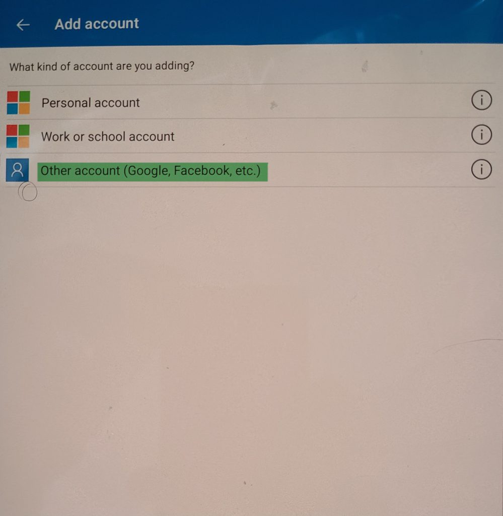 - Choose “Other account” (or “Work or school account” – either should work). Don’t choose “Personal account”.