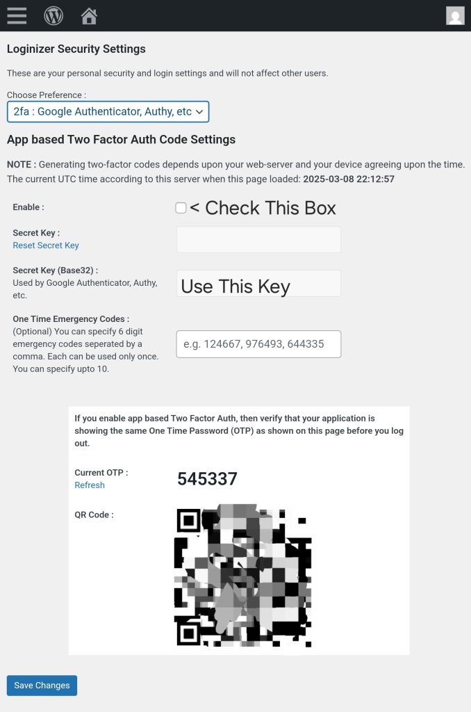 - Scroll to the bottom of the MoaM Blog dashboard page and click the “Save Changes” button. Don’t skip this step, or your 2FA settings won’t be saved!
