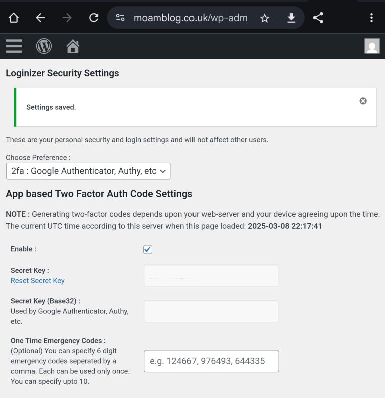 - Back in your MoaM Blog dashboard, there will likely be a field to enter a verification code (or Loginizer might automatically detect the setup once the code is scanned). Enter the current six-digit code displayed in the Authenticator app.